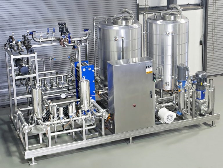 CIP裝置根據(jù)不同的分類,有不同的組成,但一般來說,它由罐(桶)、管路、加熱器、泵、控制柜及附帶設(shè)備所組成。整個裝置一般常用不銹鋼1Cr18Ni9(SUS302)、 0Cr19Ni9(SUS304)、0Cr17Ni12Mo2(SUS316)和1Cr18Ni9Ti來制作。罐是用來存儲清洗液的,內(nèi)壁必須經(jīng)拋光處理,內(nèi)表面Ra≤1.0μm;外表面Ra≤2.5μm可根據(jù)需要來做處理;上下封頭采用碟形和橢圓形,底封也可用錐形,錐角可參考安息角設(shè)計便于清洗;管路按作用可分為進水管路、排液管路、加熱循環(huán)清洗管路、自清洗管路等,管路中的控制閥門、在線檢測儀、過濾器、清洗頭等配置按設(shè)計要求配備; 加熱器常采用板式熱交換器、蛇形盤管形式間接加熱,也可用無聲蒸汽直接加熱。板式熱交換器的優(yōu)點是眾所周知的傳熱系數(shù)高、占地空間較小,但相對價格高、易堵塞;盤管式熱交換器的優(yōu)點是結(jié)構(gòu)簡單,價格低,但要放置罐內(nèi),易結(jié)垢,表面要進行人工清洗;無聲加熱器結(jié)構(gòu)簡單,價格低,熱效率高,但易改變槽液濃度,且易結(jié)垢;泵常采用離心沖壓式,該種泵的特點是過流部位均被拋光,沒有死角,易清洗干凈,故俗稱衛(wèi)生泵。