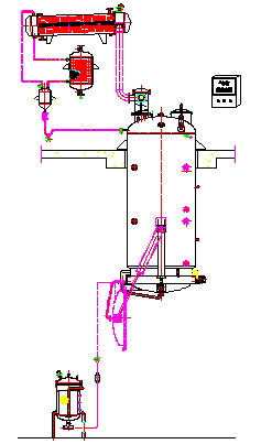 提取罐內(nèi)加溶劑,浸泡后,通過夾套蒸汽加熱。罐內(nèi)藥液沸騰,根據(jù)各溶劑的沸點(diǎn)不同,開始,低沸點(diǎn)組份先進(jìn)行沸騰變成二次蒸汽通過冷凝、冷卻到油水分離,可根據(jù)工藝情況確定是否回流或進(jìn)行排放。油水分離器利用油水的密度不同而進(jìn)行上、下分層,從而得到揮發(fā)油。另由于加熱過程中,主罐內(nèi)上、中、下部藥液存在濃度差,可以使藥液從主罐底部通過過濾器和泵打回到主罐上部進(jìn)行循環(huán),實(shí)現(xiàn)動(dòng)態(tài)提取。