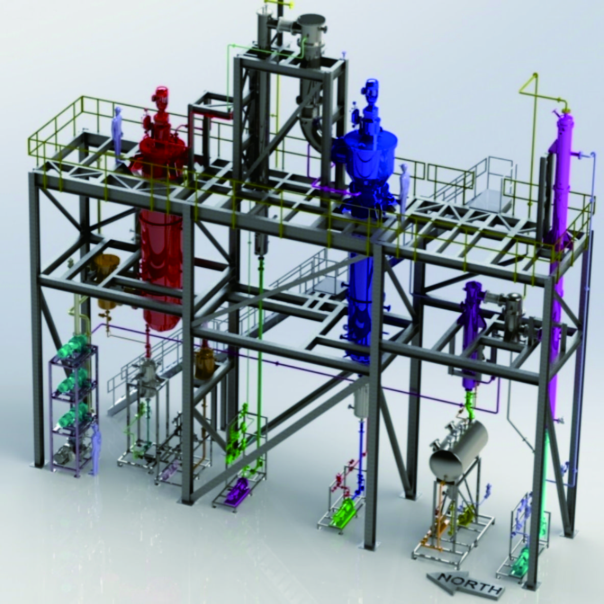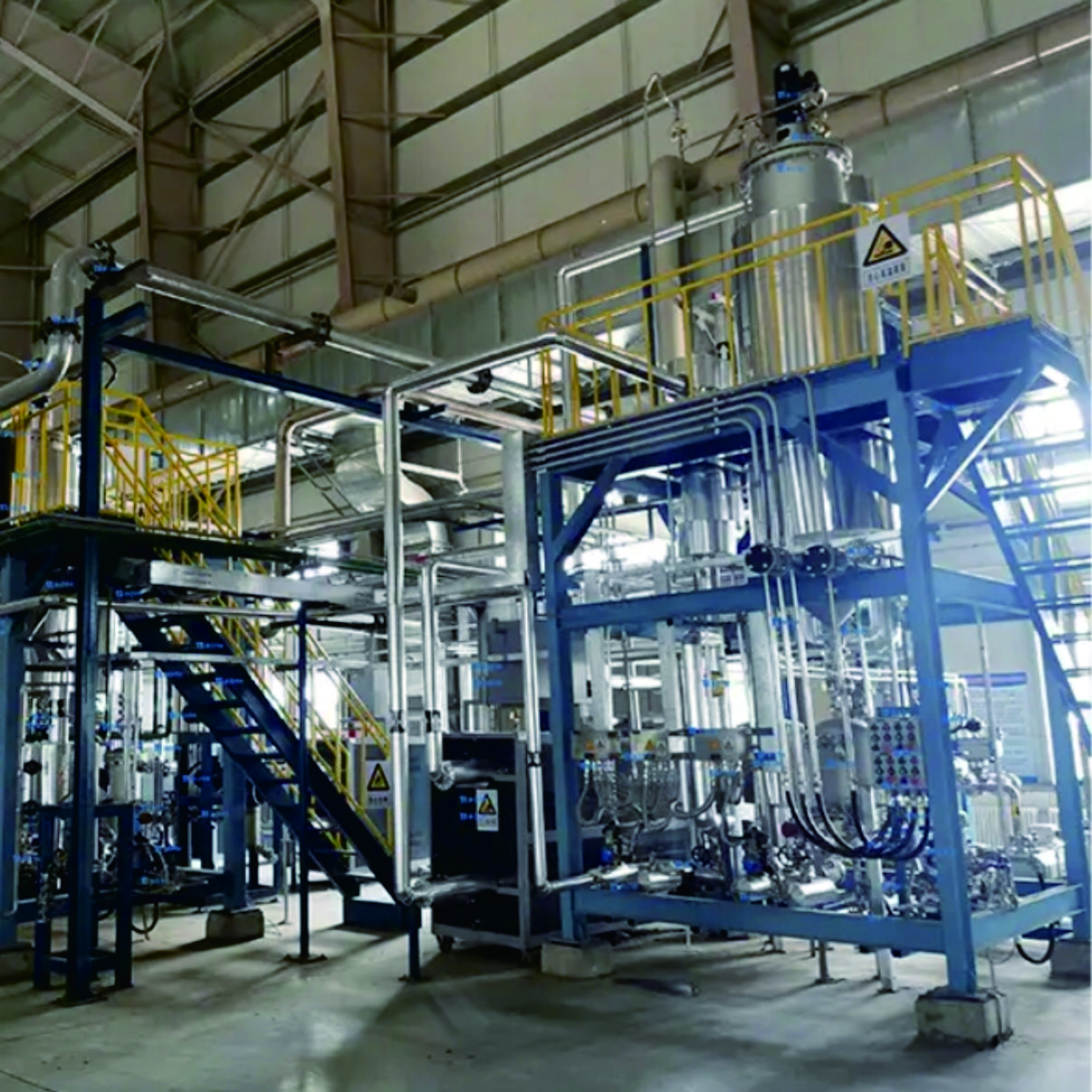 如果產(chǎn)物是有兩種及其以上單體通過(guò)化合或聚合反應(yīng)而成,則反應(yīng)的平衡混合物 中往往含有剩余的游離單體和分子量更大的過(guò)聚體及副產(chǎn)物。為了得到純的產(chǎn) 品,需要對(duì)平衡混合物進(jìn)行脫除游離單體的分離過(guò)程。隨著對(duì)游離單體允許殘 留量的不同,可考慮采用薄膜蒸發(fā)與分子蒸餾技術(shù)。典型例證有:環(huán)氧樹(shù)脂、 環(huán)氧油、聚胺酯、異氰酸鹽、樹(shù)脂塑料、可塑劑、穩(wěn)定劑、丙烯酸鹽;單硬脂酸 甘油酯、二甘酯、脂肪酸二聚體、有機(jī)中間體(如酯類、胺類合成有機(jī)物等)。