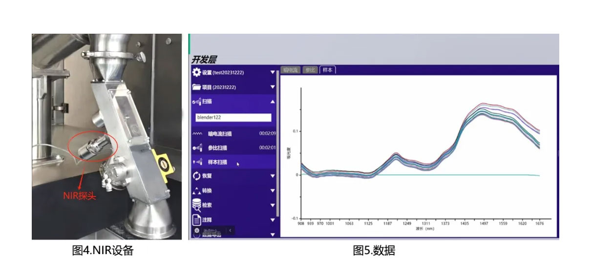 如圖4所示,在連續(xù)混合機(jī)出料口的NIR設(shè)備,可實(shí)時(shí)監(jiān)控混合過程中API與輔料的混合均勻度及水分含量,并且數(shù)據(jù)可以直觀顯示(圖5)。