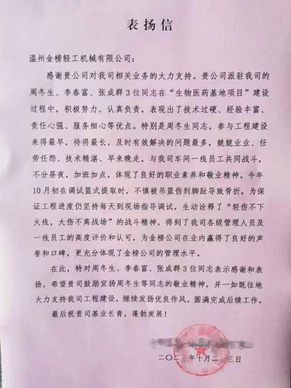 “周冬生、李春富、張成群在項目建設過程中,積極努力,認真負責,表現(xiàn)出技術過硬、經(jīng)驗豐富、責任心強、服務細心等優(yōu)點?!?“及時有效解決問題,兢兢業(yè)業(yè)、任勞任怨、技術精湛、早來晚走,與車間一線員工共同戰(zhàn)斗,不分晝夜,加班加點,體現(xiàn)了良好的職業(yè)素養(yǎng)和敬業(yè)精神。” 10月23日,溫州金榜輕工機械有限公司收到了一封來自合作客戶的表揚信,該企業(yè)在信中對我司工作人員表示高度評價和贊揚。